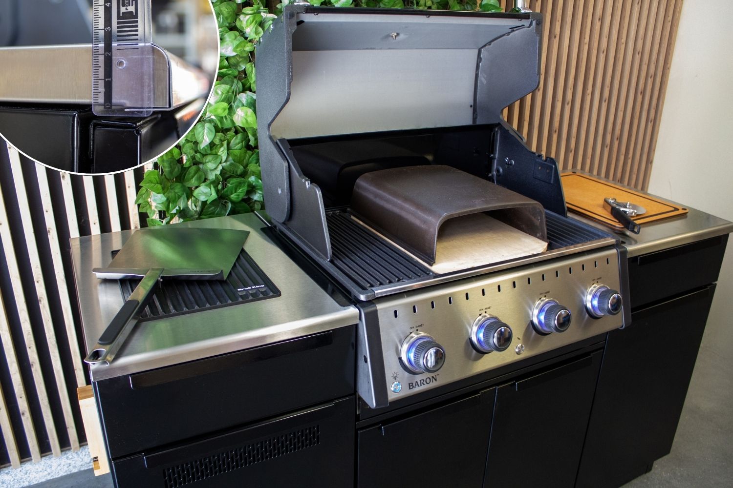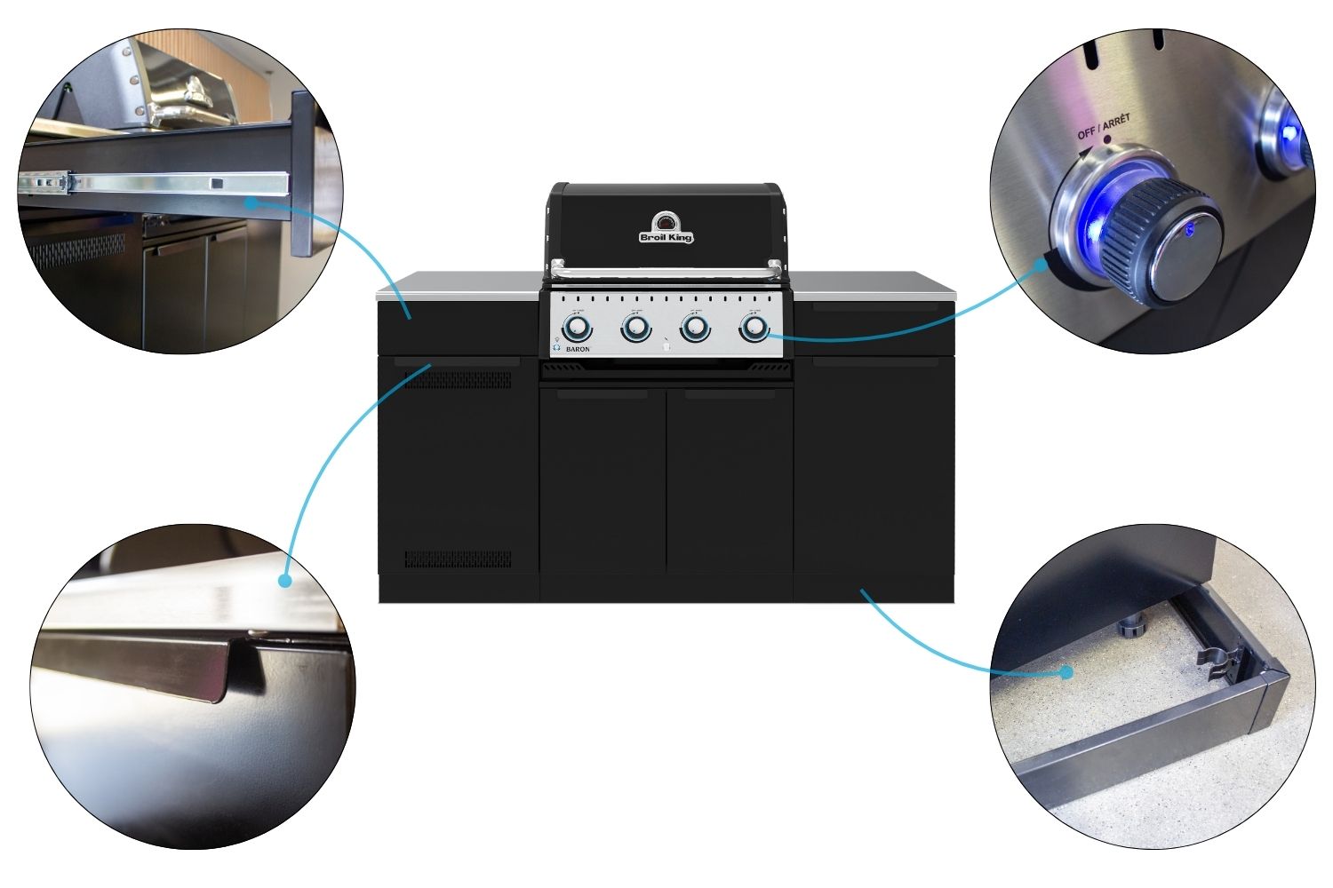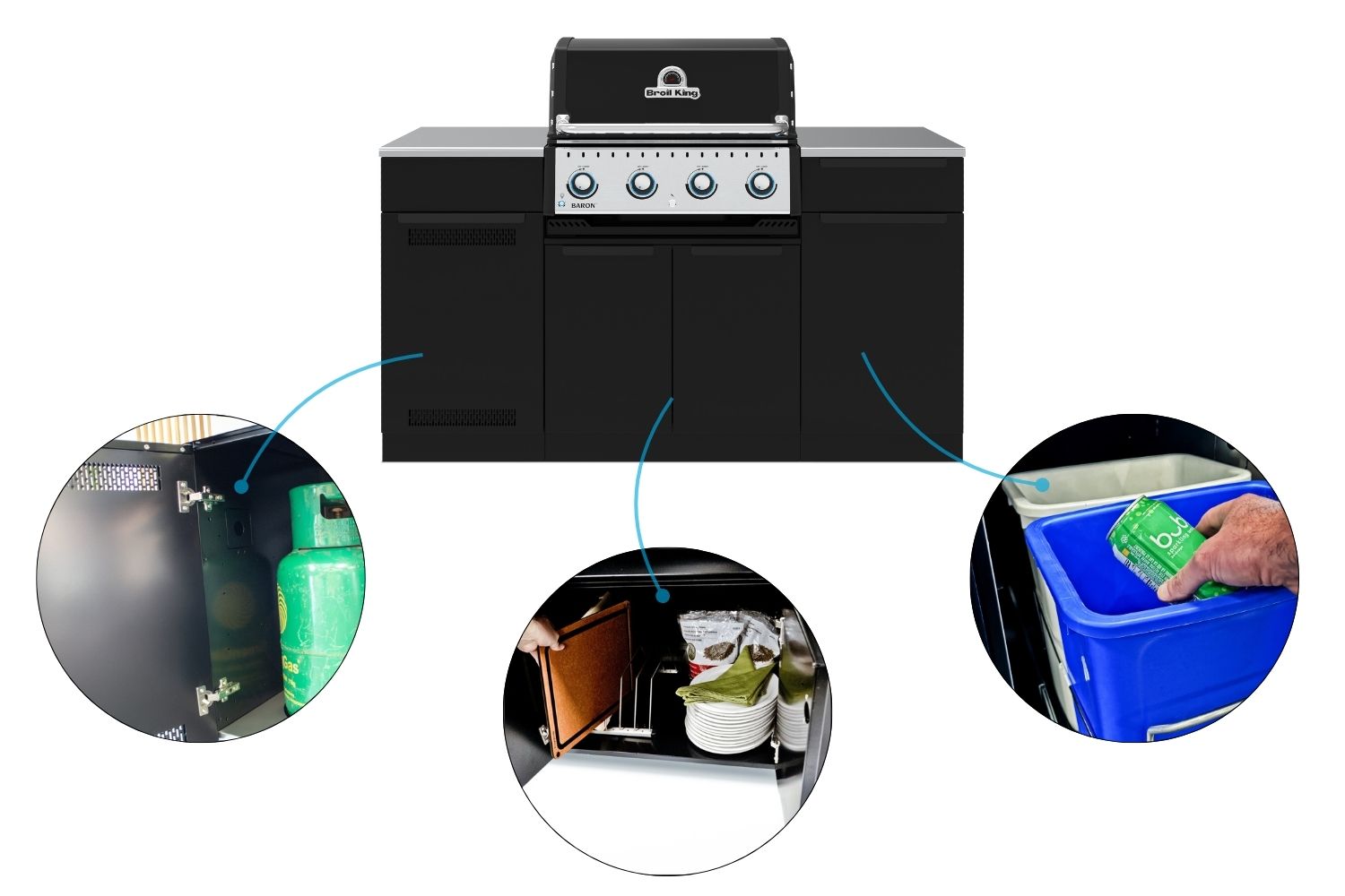 • Zestaw Modułowy: Wyspa składa się z grilla Baron™ 420 BI do zabudowy, dedykowanej szafki pod grill, szafki na butlę gazową oraz szafki z dwoma koszami na odpady.
