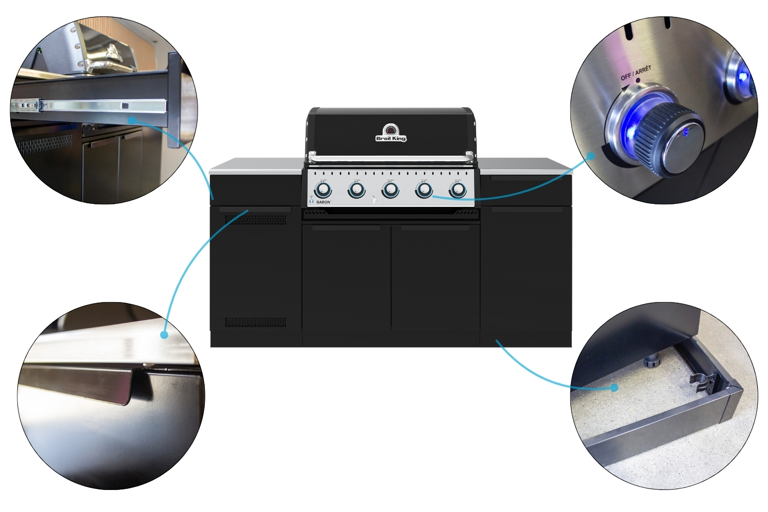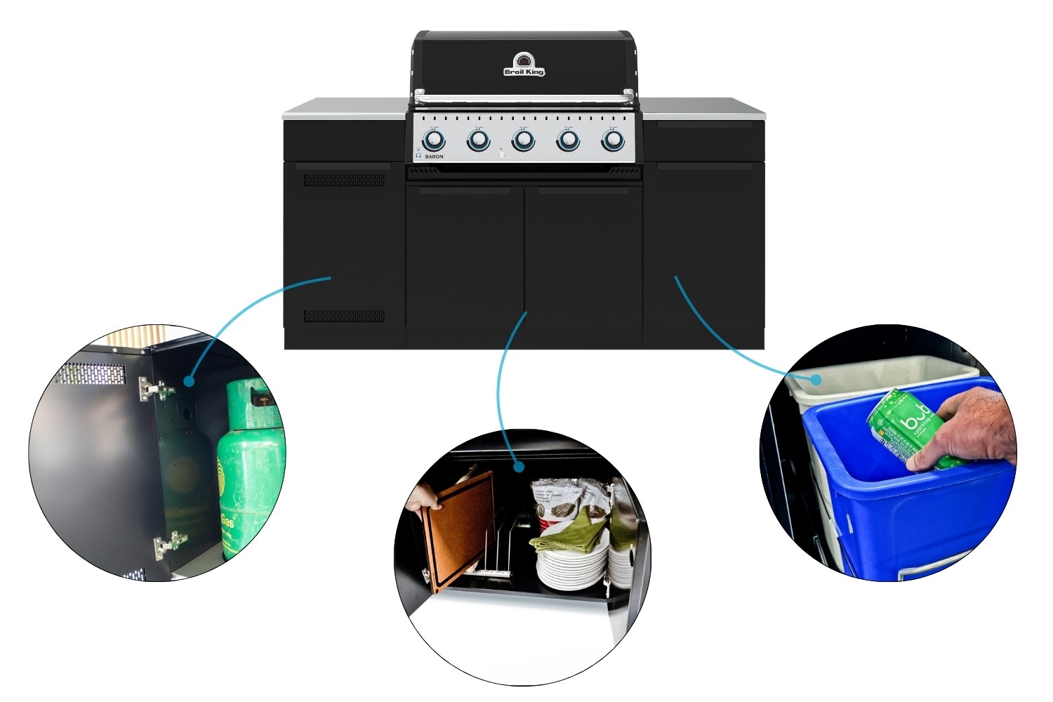 • Zestaw Modułowy: Wyspa składa się z grilla Baron™ 520 BI do zabudowy, dedykowanej szafki pod grill, szafki na butlę gazową oraz szafki z dwoma koszami na odpady.